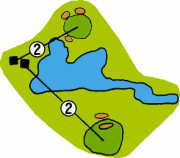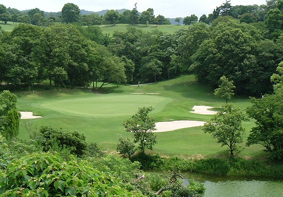 (Aクラスの競技以外は左のサブグリーンでプレー) 軽い二段グリーン。 140ヤードの表示からグリーン中央まで120ヤード。